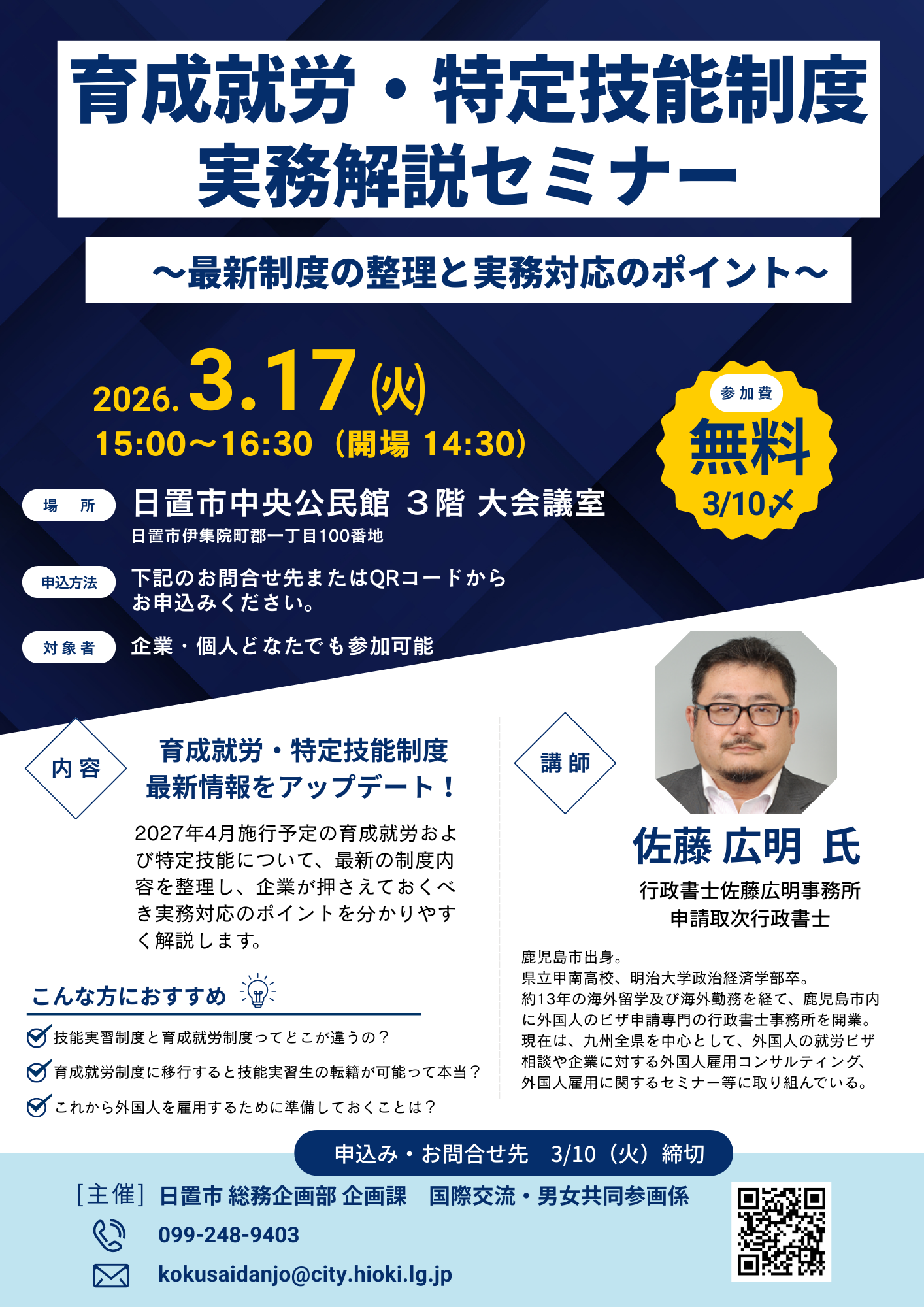 - 育成就労・特定技能制度実務解説セミナー、令和8年3月17日開催